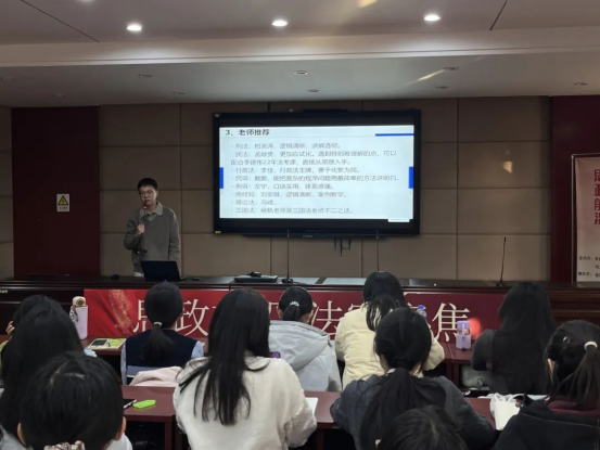 随后,许晴学姐将从四方面分享她的双考经验。一是时间规划上,效率是核心。8月完成刑法、民法等四科基础背诵;法考重合期强化重点;冲刺阶段分时段交叉背诵,且“结束一科再开下一科”。二是科目突破,要抓重点攻难点。核心科目刑法、民法,刑法注意行为定性的区分,民法则是重者恒重;法理宪法需在法硕记忆基础上自我扩充;程序法靠口诀记期限、区分概念;三国法精准记考点,商知经、行政法也有对应高效复习法。三是实战经验,牢记坐满四小时后要保持运动,有好的身体才能更好备考。四是资源推荐方面,她为同学们推荐了备考老师和方法,希望同学们少走弯路。最后她向正在备考的同学送去祝福,祝同学们双考双赢!