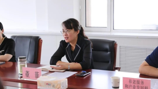 会议伊始,董菲对公司一行人的到来表示热烈的欢迎。她首先指出了目前人口老龄化的严峻现实问题,并表示应加大对养老服务产业的扶持力度,不断创新养老产业发展模式,加强政府的补贴力度,适时进行调研活动来了解老人所需。同时做好承接吸引京津老人来河北养老的工作,促进养老服务产业体系的高质量发展。董菲的讲话为公司社会实践小分队指明了调研的方向和侧重点,为后续具体工作的开展起到了引路灯的作用。
