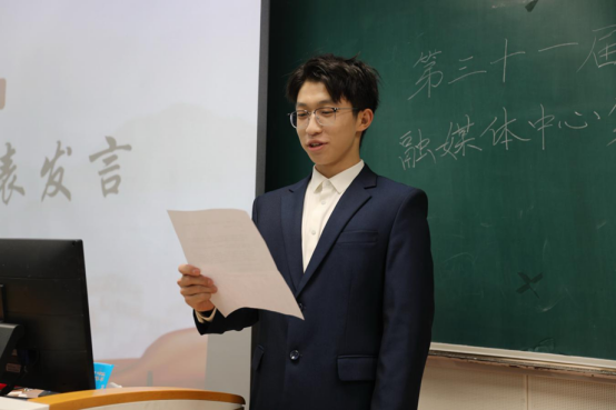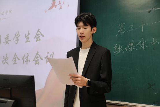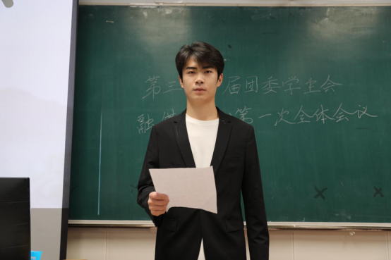 随后,优秀部门代表、员工会主席柳淞森发言,他首先向新加入的员工干事致以热烈欢迎,对第三十届团学融的工作成果进行简要回顾;同时着重提出,新学年要进一步强化部门协同、凝聚团队合力,以更高标准、更实行动为学院的发展注入青春动能。
