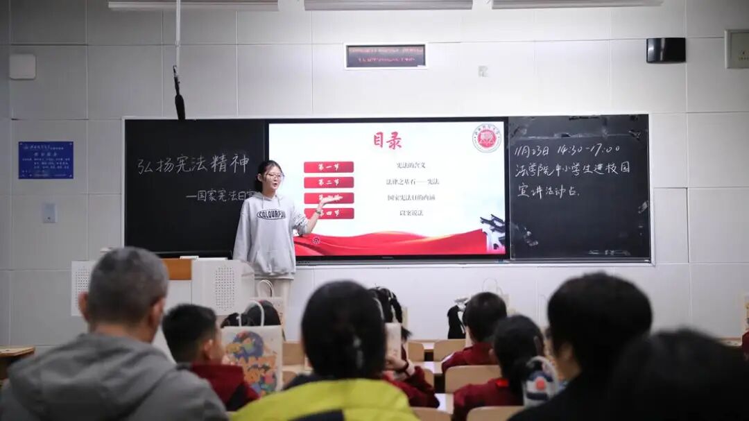 法律宣讲环节以庄严的宪法宣誓拉开序幕。宣讲员带领孩子们举起右拳,“我宣誓,忠于中华人民共和国宪法……”稚嫩的声音坚定有力,将宪法精神的种子悄然植入心田。随后,宣讲员用通俗生动的语言解读宪法作为国家根本大法的核心地位,通过展示国旗、国徽图片,详细讲解其象征意义与国歌的历史由来。互动问答环节中,“国旗上的五星代表什么?”“宪法和我们的生活有关系吗?”等问题引发孩子们热烈反响,大家踊跃举手、积极抢答。答对的孩子收获了宪法小册子、法治书签等奖品,自豪的笑容洋溢在脸上,在趣味互动与正向激励中,深刻铭记宪法的重要性与国家标志的庄严。